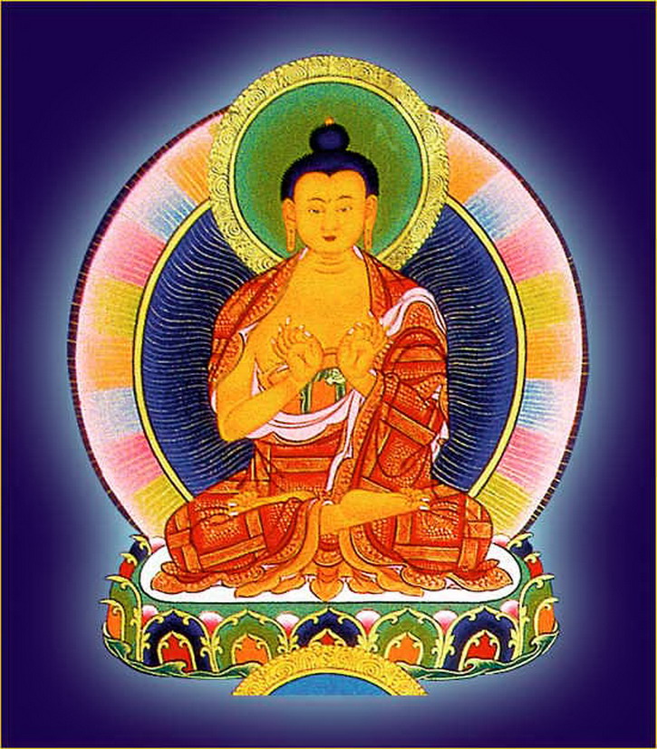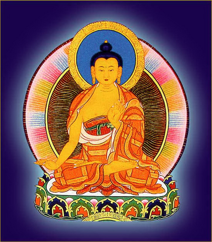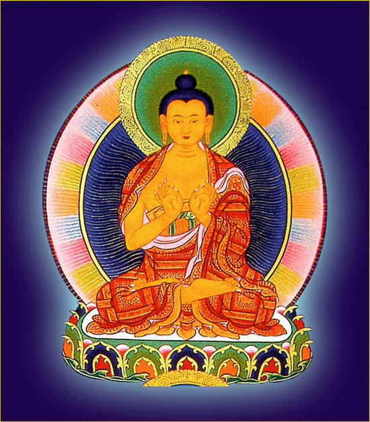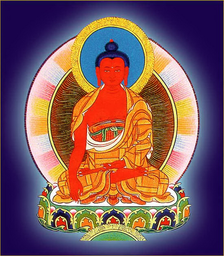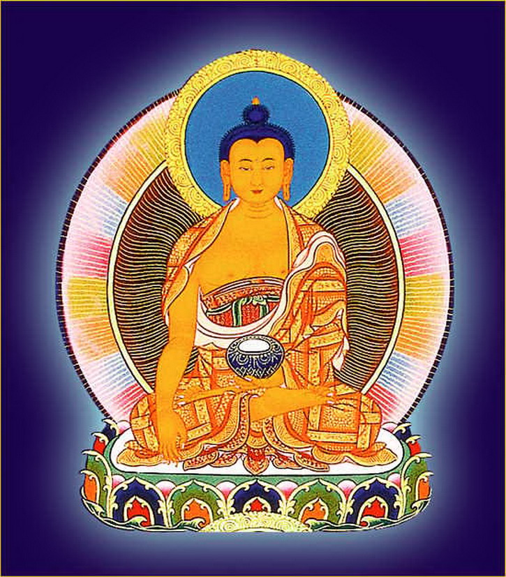 娑婆世界之释迦牟尼佛,身纯金色,右手按地,左手结定印,上托满盛甘露之钵。着出家三衣,三十二相,八十种好,额喉心三处嗡啊吽三字庄严,光明莹澈,体似琉璃,于自身所出光蕴之中结金刚跏趺而坐(以下各佛庄严同此。)顶礼此佛可消除十一万大劫罪障。