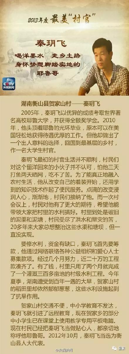 还好,中国的年轻一代并没有完全灭失情怀,我在媒体上看到了一位情怀满满的海归精英学子,耶鲁大学的学霸,手握政治学和经济学两个重磅学位,拿着这样的文凭在美国找份薪水不错的工作应该不难。但是他选择回到自己的祖国,在湖南的落后山寨贺家村当了一名大学生村官。