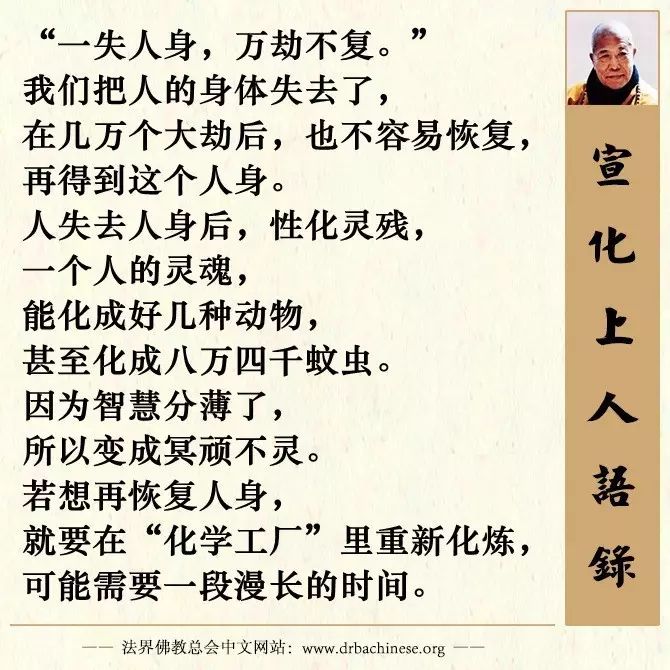 那么,分开有什么不好呢?分得零零碎碎,再想把灵性聚一起,就不容易了,千百亿劫恐怕也不能复得人身。这时性化灵残,与草木同朽,变成无情的植物。本性分散了,便不容易做为众生。纵使能做众生,譬如一个人身,能化为八万四千蚊虫,但若要把那八万四千蚊虫重聚在一块,则不容易。蚊虫多数重新做蚊虫,头出头没,生死轮回,总不知道背尘合觉,舍迷归正的。所谓“一失人身,万劫不复。”诸位若能深明其义,可不惧哉!