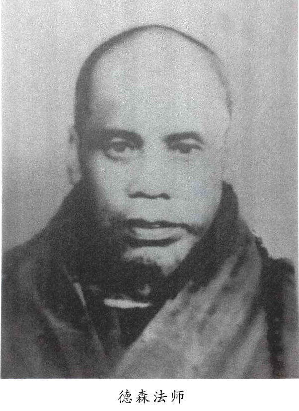 德森和尚俗家姓杨,名隆 ,江西省兴国县人,清光绪九年癸未(一八八三年)出生,自幼受学塾教育,年逾弱冠,有感于世事无常,而有出世之心,乃于民国元年(一九一二年)三十岁时,舍俗离乡,投身于福建***汀县报恩寺,依今彩老和尚剃度出家;民国二年(一九一三年)春,在江西省宁都县大乘寺受具足戒,同坛受具的,还有以后数十年同参道侣了然法师。圆戒后仍回到长汀县报恩寺,依今彩老和尚修行。民国八年(一九一九年)今彩老和尚往生,德森为师父料理身后事宜,一切如礼。