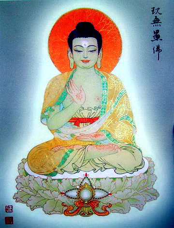 南无现无愚佛:北方鼓音世界之现无愚佛,身绿色,右手作施无畏印,左手当胸作合掌状,掌心向外,拇指略离食指。