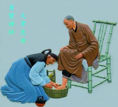 黄檗的母亲因为思念长年毫无音讯的出家儿子,每天哀伤地哭泣,结果把眼睛都哭瞎了。为了见儿子一面,她在路旁设司茶亭,招待过往的云水僧,并且迎回家中,亲自为他们洗脚,以示礼敬。其实,她的心里渴望着能借此机会与儿子重逢,因为黄檗禅师左脚上有颗大痣,虽然她眼睛瞎了,但凭着万分之一的洗脚几率,或或许可以认出她的爱子。