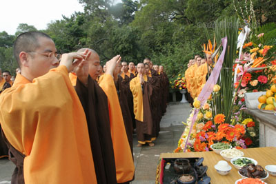 今天上午8时40分,南普陀寺、闽南佛学院、虎溪岩寺和南普陀实业社的僧俗四众排着整齐的队伍在妙湛老和尚舍利塔处,为老和尚祭辰10周年举行佛教祭奠仪式。则悟大和尚与了法法师、界象法师、传明法师等与大家共同礼拜灵塔,诵念佛经。 下午16时,则悟大和尚领众在大雄宝殿为妙湛老和尚举行往生普佛法事。 妙湛老和尚,出生于1910年11月,辽宁丹东人。1939年出家,1957年入住南普陀寺。生前曾任南普陀寺方丈、闽南佛学院院长、南普陀慈善会会长、厦门佛教协会会长。老和尚一生爱国爱教,为佛教教育和社会公益事业孜孜不倦,尤其对闽院的复办作出卓越贡献。慈悲济世精神于海内外享有盛誉。1995年于南普陀寺安祥示寂,时年86岁,戒腊56岁。临终留书“勿忘世上苦人多”的遗训为后人广为传颂。 饮水思源、知恩报恩是南普陀与闽院的优良传统,悼念先贤是此精神在实践中的发扬,更能加强僧人学修并重意识。