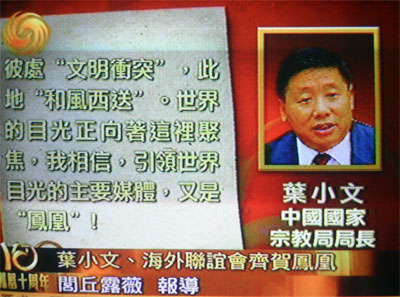 中国国家宗教局局长叶小文电贺凤凰卫视十年台庆