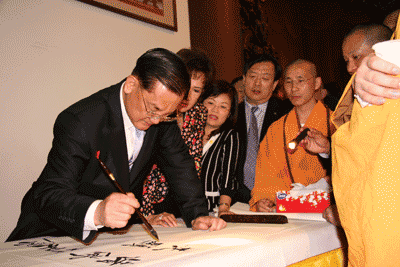 灵隐寺监院觉乘法师率领两序大众对连战主席一行表示热烈欢迎。随后,连主席一行参观了天王殿、大雄宝殿、药师殿,还有文物馆,饶有兴致地听取了觉乘法师对灵隐寺近一千七百年悠久历史的介绍。在大雄宝殿里,连主席同夫人虔诚地上香问讯。一路上,寺内优雅的环境、宏伟的殿堂、珍贵的文物,让连主席赞叹不已。当听到灵隐寺刚刚同台湾中台禅寺缔结成为同源友好禅寺时,连主席连声说道:“很亲切、很亲切”,并对两岸“禅源一脉”表示高度认同。最后,连主席在直指堂挥毫泼墨,写下“春水共长天一色,众佛于灵隐并显”,并对觉乘法师的热情接待表示感谢。觉乘法师代表灵隐寺方丈木鱼长老,向连主席赠送了一尊檀香木弥勒佛像等礼品。临别前,连主席还亲切地同大家合影留念。