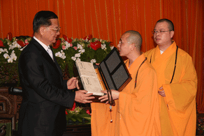 监院觉乘法师代表灵隐寺向连主席赠送灵隐寺志