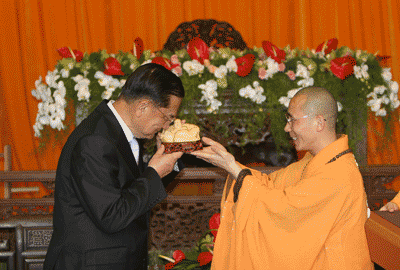 监院觉乘法师代表灵隐寺向连主席赠送檀香木弥勒佛像
