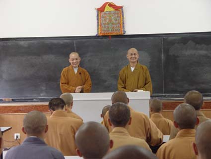 贤空法师(左)向同学们介绍法空法师