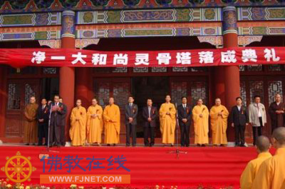 参加此次灵骨塔落成典礼的有真如禅寺全体僧众,及法门寺智超法师,洪利法师,本正法师,智光法师,法门寺佛学院法辉法师及部分学僧,宿迁市委书记张新实..副市长田洪,市宗教局局长伍庆宝及宿迁市佛协等领导人士。在落成典礼上,现任真如禅寺住持智严法师,法门寺智超法师,分别深切缅怀净一老法师爱国爱教爱家乡,勤俭质朴的感人事迹。赞扬了净公上人伟大的僧格和无私奉献的精神。宿迁市副市长田洪也作了热情的发言,赞叹了净公老法师爱国爱教爱家乡的高尚情操。