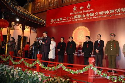 本次寒山寺除夕听钟声活动已是第28届,31日,江苏省委常委、苏州市委书记王荣,苏州市委副书记、市长阎立,苏州市领导周福元、冯瑞渡、周向群、周伟强、王少东、肖汉涛、汪国兴、周性光、吴文元、范佐、谭颖、吴砚池、金明,日本池田市日中友协会长藤尾昭、金泽市日中友协代会长西野正次等参加了听钟声系列活动,共祝苏州市人民和海内外嘉宾生活美满、万事如意。