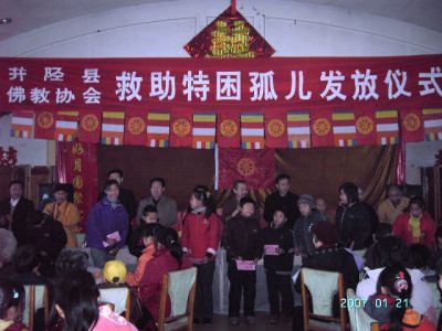 据弘德家园报道:2007年1月21日腊月初三,河北佛教慈善功德会、井陉县佛教协会在井陉举办了“资助贫困孤儿特困学生”活动。此次活动受资助学生的产生,是由井陉县团委、县妇联、县民政局等单位通过在全县摸排、调查全县九年义务教育段的学生情况,根据在校贫困生以及 家庭内人员收入等综合情况汇总,共有140名学生被选列出来。这次被资助的每名学生得到了200元助学金,路费20元。总共资助金额31000元。以及衣服一包。另有一些特困学生及孤儿的情况被慈善会采集,待进一步调查情况后,在征得学生的监护人和有关部门认可同意办理相关手续后,进入石家庄“弘德家园”学习和生活。