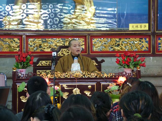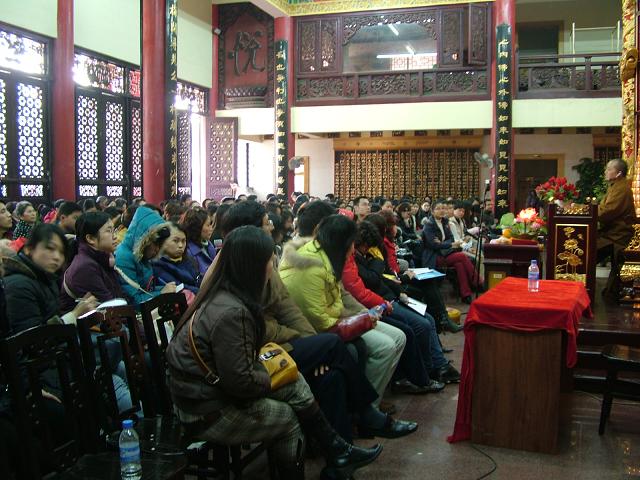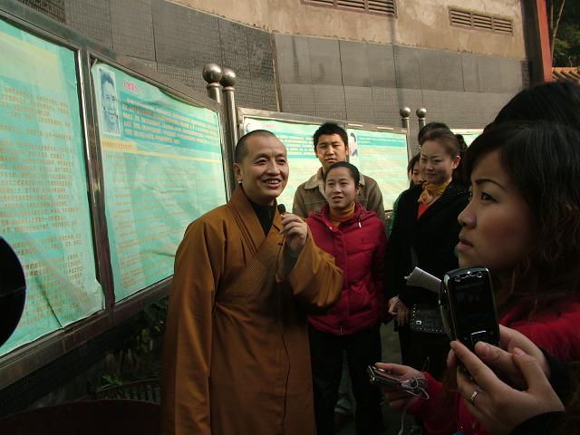 讲座完毕,道坚法师带领导游们从华岩寺弘法楼、佛教文化长廊、经过山门、大雄宝殿到重庆佛学院,游览了整个华岩寺。道坚法师做了一回导游们的导游,详细地解说了华岩寺各处景点的古往今来。