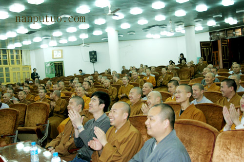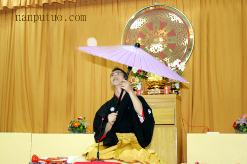 4月27日晚7时,日本相声界大师海名老香叶子女士,林家一平大师,林家胜丸大师在南普陀寺讲堂作精彩表演。我寺方丈则悟大和尚,传明法师、德煌法师、法尊法师、静安法师等各堂口执事,市民宗局一处钟小波先生以及本寺全体僧众、闽院男众部学僧和本寺员工到场观看。