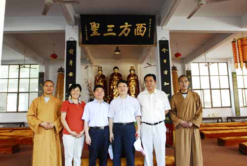 图(左4)建设部副部长黄卫(左2)黄石市副市长周慰芬(左3)省政府副秘书长(右2)黄石市安监局陈局长(左1)东方山弘化禅寺监院智超法师(右1)东方山弘化禅寺智维法师