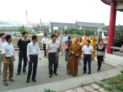 道坚法师(右三)正在陪同翁杰明部长(右四)参观将归还华岩寺作重庆佛学院女众部道场的原华岩小学