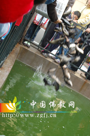 在宝塔开光法会前,正觉寺的监院仁达法师主持放生法会,将数以万计的鱼儿放归正觉寺的放生池中,使鱼儿得以自由遨游。