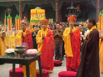 中国佛网讯 2007年10月27日下午,重庆华岩寺为期七天的水陆法会举行圆满送圣仪式,居士及信众近千人参加了此次法会仪式。 重庆华岩寺四众弟子在方丈道坚法师的带领下,仪式庄严而隆重。上千人的送圣队伍浩浩荡荡,声声“南无阿弥陀佛”的佛号中,在弘法楼前送圣:镇坛大将军手持“慈航普渡”和“镇守坛前”幡旗。一艘纸质西方大船,船边堆满了纸折莲花及金元宝。众僧列队一起唱诵,并把二十四席牌一一放到西方大船里。然后,三位法师率众僧及信众起腔念佛。在沉稳的佛号中,一位僧人鸣放鞭炮,点燃西方船,祈愿镇坛大将军可以护持西方船上的所有亡灵顺利往生西方。 下午3点,仪式在信徒虔诚发愿中圆满功德,标志着华岩寺一年一届的水陆法会,殊胜圆满。