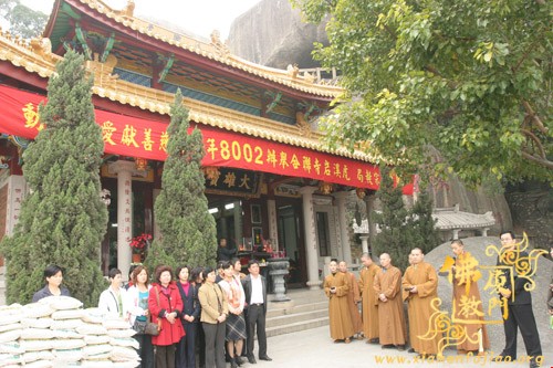 【厦门佛教在线】1月8日报道:今天上午8时30分,厦门虎溪岩寺与厦门市思明区民宗局在虎溪岩寺大雄宝殿前举行迎新春、献爱心慈善捐赠活动。思明区民宗局局长黄诚、虎溪岩寺全体僧众、思明区各街道领导及虎溪岩寺护法居士一起参加了此次活动。