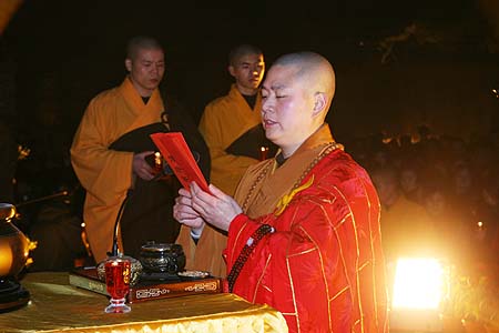 九时三十分,“传灯法会”在缈缈梵呗声中拉开序幕。先依佛教传统仪规,诵经祈福。主法可祥法师在大众齐诵“南无本师释迦牟尼佛”圣号中开始传灯,佛光由台上蔓延到台下,每一位参与者将手中的烛光传给身旁的人,然后灯灯相传。点点烛光,交辉呼应,幽暗的广场顿时变成光的海洋,一时天上人间。在传递心灯时,大家相互寄语“平安吉祥”、“合家安康”……祈祷国泰民安、世界和平。接着,大家手棒“心灯”,一起颂唱“燃灯之歌”。