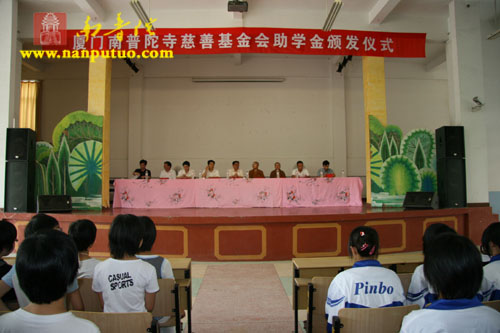 主席台上,普陀法师、果瑞法师以及各级领导亲自为学生颁发助学金,普陀法师还鼓励学生:要好好珍惜学习机会,努力拼搏,将来为祖国、为家乡做出更大的贡献。