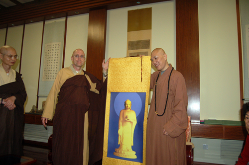 在方丈室里,大安法师热情接待了这些远道而来的贵客。“上人生前不但教我们坐禅,也带我们打佛七。上人在打佛七的时候就常讲,净土宗的发源地是在庐山东林寺”。恒实法师向大安法师简单介绍了近几年万佛城的发展情况,感叹现在西方年轻人宗教情怀的普遍缺失。“前段时间有几个欧洲的青年人到万佛城打观音七,他们原本是没什么宗教信仰的,念了几天圣号,感觉非常受用,身心都很愉悦。在欧美国家,净土法门还是没有普及开来。”