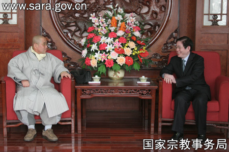 1月22日中午,王作安局长在局贵宾厅会见了韩国佛教曹溪宗总务院新任总务部长林影潭法师一行2人。 王局长对林影潭法师来访表示欢迎。他说,影潭法师为推动中韩两国佛教交流做了大量的工作,是我局和中国佛教界的老朋友,我于去年接替叶小文先生担任国家宗教局局长,会一如既往地支持两国佛教界开展交流,希望林影潭法师今后在推动中韩两国佛教友好关系方面发挥更大的作用,在深化两国佛教友好、丰富交往内涵方面多提宝贵意见,相信两国佛教友好对推动两国人民间友好往来会发挥重要的作用。林影潭法师对王作安接任国家宗教局局长表示祝贺,并表示韩国佛教曹溪宗十分珍惜与中国国家宗教局和中国佛教界的友好关系,并愿意进一步加强联系和合作。 会见结束后,蒋坚永副局长宴请了林影潭法师一行。