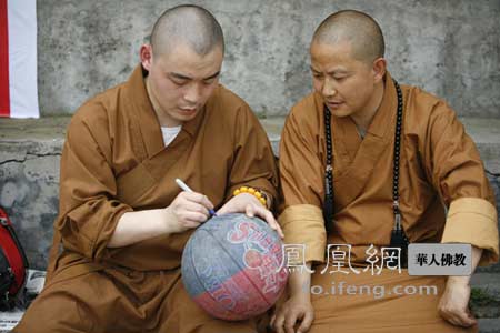 上海龙华寺明智法师在洛水之球上签字(图片来源:凤凰网华人佛教)