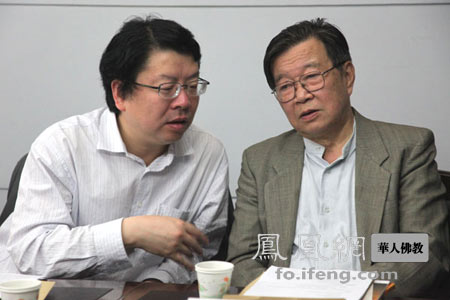 张晓敏社长和朱维铮教授亲切交谈(图片来源:凤凰网华人佛教)