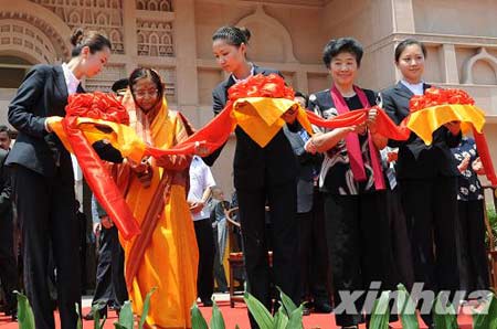 5月29日,印度总统帕蒂尔(左二)和中国全国政协副主席王志珍(右二)为印度风格佛殿落成剪彩。(图片来源:新华网 新华社记者赵鹏 摄)