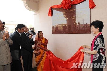 5月29日,印度总统帕蒂尔(右二)和中国全国政协副主席王志珍(右一)为印度风格佛殿落成揭碑。(图片来源:新华网 新华社记者赵鹏 摄)
