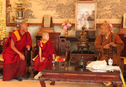 2010年6月26日上午,青海塔尔寺第五世却西仁波切一行到北京灵光寺参访并参拜佛牙舍利塔,灵光寺方丈常藏法师热情的接待了却西仁波切一行,双方并亲切座谈交流。