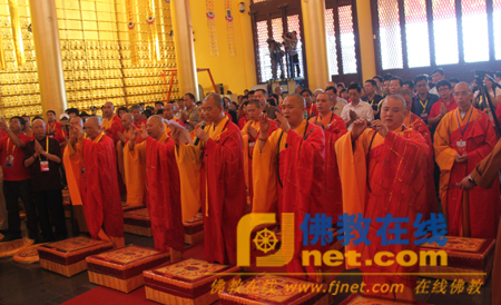 11时许,金玉弥勒开光法会在大金佛寺殿内隆重举行。诸山长老及党政领导瞻礼弥勒圣像。随后,维那僧众进殿,居士鱼贯而入,磬响鼓振,维那引领诵经。学诚法师、明生法师、永寿法师等为佛像主法开光,加持大悲水,为大众普降甘霖,在场的每一位信众都欢喜踊跃,法喜充满。近12时,开光庆典法会圆满结束。