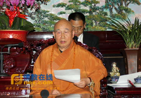 中佛协会长传印长老首先代表中佛协及他本人对持田日勇会长为团长的“日中友好宗教者恳话会”第十二次友好访华表团的到来表示了欢迎。传印会长在讲话中回顾到,五十七年前,大谷莹润、西川景文、小野塚润澄、大河内隆弘、菅原惠庆、椎尾辩匡、高阶珑仙、清水谷恭顺、山田无文、冢本善隆、大西良庆等诸位长老及日本佛教界无数先德贤达,克服重重障碍,历时十一年,开展了“收集和送还在日中国死难烈士遗骨”;广泛征集“日中不再战”签名活动,体现出贵会及日本佛教界对中国佛教界和中国人民的深情厚谊,为战后中日友好做出了突出贡献,载入了中日民友好交流的史册。传印长老对近些年来,以持田会长为代表的“日宗恳”,通过积极参加“中韩日佛教友好交流会议”、“世界佛教论坛”以及派遣访华团等丰富多彩的方式,活跃在巩固和发展两国佛教“黄金纽带”、促进中日世代友好的最前线的这种做法表示感谢和敬佩。同时,传印长老表示,中国佛教协会和广大中国佛教信众,决心继承已故中佛协赵朴初会长等先辈们的遗志,一如既往地珍惜中日两国佛教的殊胜法谊和两国人民的传统友谊,中日友好之树必将在佛光照耀和两国佛教徒辛勤培育下根深叶茂、万年长青。