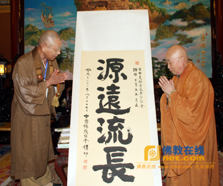 传印长老向“日宗恳”会长持田日勇团长赐送“源远流长”墨宝一幅