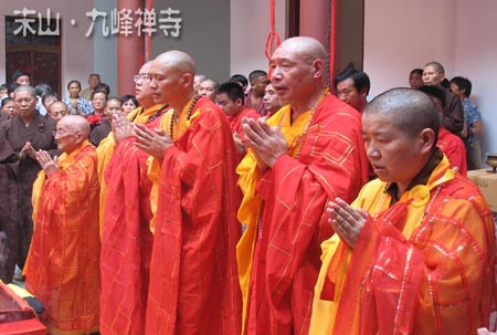 当天上午九时,在庄严的国歌和三宝歌中观音殿竣工上梁典礼正式开始。典礼由江西省佛协副会长、九峰寺监院顿成法师主持,慈化寺方丈妙安法师首先发表了致辞。随后,在诸山长老的带领下,在庄严的梵呗声中,观音殿竣工上梁仪式圆满结束。在场信众脸上洋溢着喜悦的笑容,而观音殿的落成也为九峰禅寺奏响了复兴序曲。