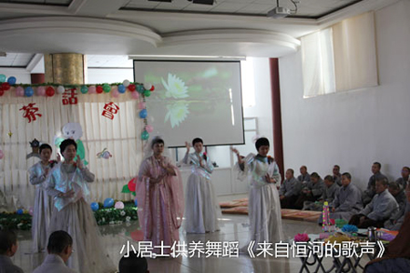 普寿寺佛学院每个班级的学僧采用歌舞、小品、武术以及手工制作等方式,表达着自己对如瑞法师及寺院常住的感恩之情,如护法班的小合唱《我们心中的太阳》,沙弥尼的小品《济公》,小居士表演的舞蹈《来自恒河的声音》等节目。