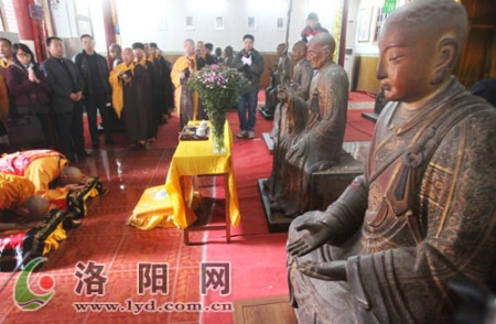 几分钟后,四名工作人员稳稳地托起罗汉的底座,将其抬起,并慢慢移动到三尊主佛前,白马寺方丈印乐法师和众法师集体跪拜在佛像前,向佛像行大礼。