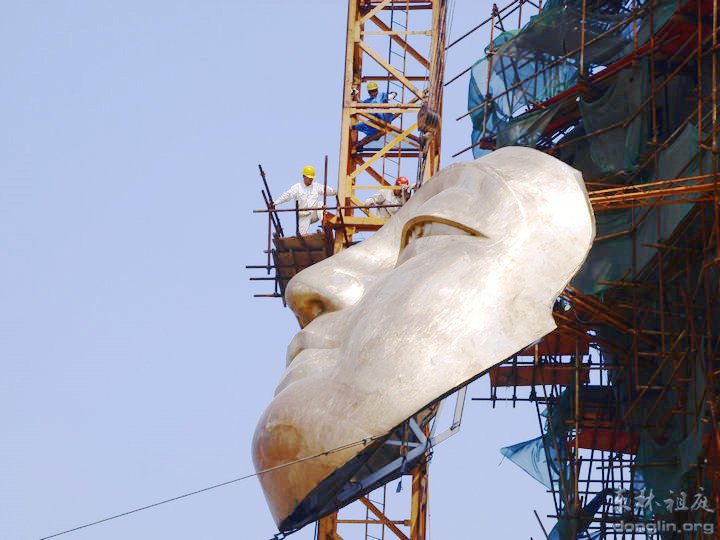 5月26日的东林大佛建设工地现场:起吊安装之前的东林大佛佛首面部(佛面总重达11吨)