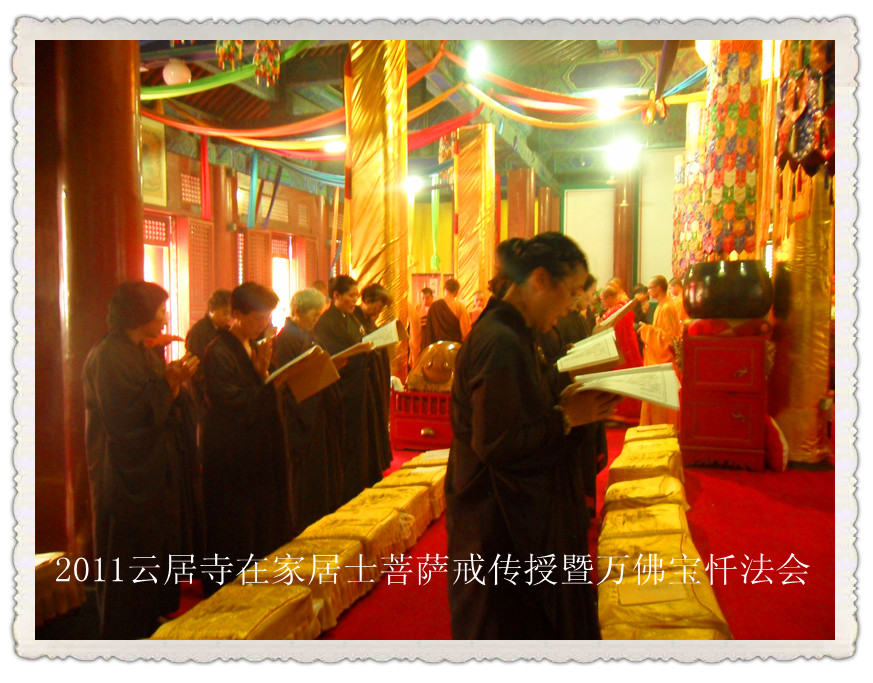 为祈正法久住,续佛慧命,引导正信,导归正觉,北京云居寺于2011年7月16日至19日举办了万佛宝忏暨在家居士授菩萨戒法会。礼请本寺监院果坚法师为得戒和尚,常固法师为羯磨阿阇黎,持扬法师为教授阿阇黎,道圆法师为引礼师。