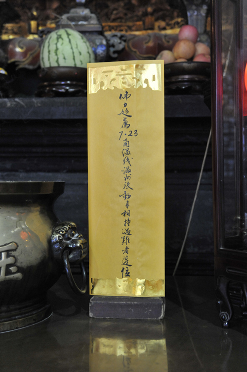 “7·23”甬温动车脱轨事件发生后,对司乘人员的救治不仅得到温州当地群众的关心和帮助,也牵动了远在的上海玉佛寺僧职员工的心。2011年7月26日上午9:15,为了表达寺院全体僧职人员对消失生命的敬重和怀念,特组织寺院法师在大雄宝殿内为事件中的罹难同胞举行超荐法会,希望通过佛教特有的悼念仪式,为死者默哀,为生者祈福。用念诵佛经的愿力超度逝者能魂归净土,早登极乐。也希望以此抚慰受难家属悲痛的心。