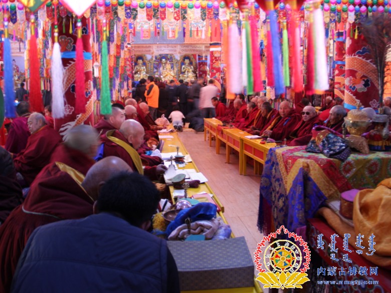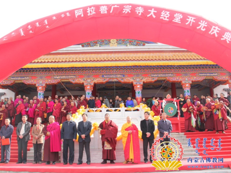 阿拉善广宗寺新大经堂经过几年的建设,已经全部完工。其规模宏大,造型独特,具有圆形重檐顶。殿内供奉三时佛、宗喀巴、十八罗汉、六严二胜、上世诸活佛灵塔,千尊白度母等。开光法会暨庆典活动于佛教四大节日之一农历九月二十二日(阳历10月18日)隆重举行。130名僧人聚会诵经,开光加持。并在当日10点30分在新大经堂前面的广场上举行了隆重的庆典仪式。自治区政协副主席董恒宇以及盟旗各部门领导、施主、信教群众数千人参加了这一活动。庆典仪式上本寺寺主贾拉森活佛致词,他说“纵观中国佛寺,有圆形顶部者不多,在布达拉宫七世达赖喇嘛时制作的胜乐金刚立体坛城的顶部是圆形的,在承德,普乐寺旭光阁的顶部是圆形的,其中供奉的也是胜乐金刚的立体坛城。我们广宗寺素有胜乐金刚宫殿之称,仓央嘉措大师一生修持胜乐夲尊。因此我们选择圆形的顶子,并非追求外型上的独特,而是具有佛理上的依据和深刻含义。”他祝愿佛法永驻,众生平安!祝福伟大祖国繁荣昌盛,各族人民幸福安康!