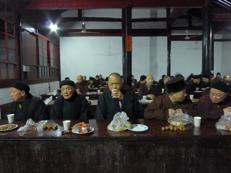 2012年1月21日,浙江省宁波市天童禅寺斋堂内气氛热烈祥和,僧俗二众一百多人欢喜参加迎新年普茶会。会上,天童禅寺方丈诚信法师作了慈悲开示,感恩寺院常住及护持寺院的各位菩萨,大家在茶香中畅谈各自的的收获。