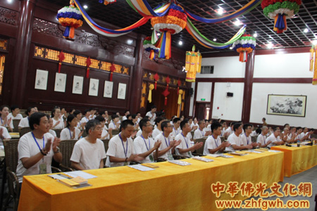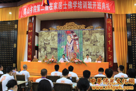 2012年7月26日上午,寒山书院第二届在家众佛学培训班开班典礼在苏州重元寺法堂隆重举行,广东省惠州市佛教协会会长妙峰法师,苏州工业园区社会事业局张武国处长,南京大学刘鹿鸣博士、寒山书院本觉法师、明空法师、能学法师、宗泽法师等,以及来自江苏、浙江、安徽、广东、山西、上海、河南等26个省、市的在家居士100名学员参加了开班典礼。