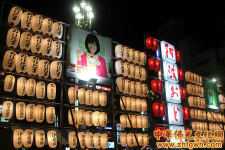 高圆寺站前挂着一排排细长的灯笼,灯笼间的“阿波舞”几个大字格外引人注目。舞蹈大会17时准时开始,从高圆寺站的站台上就可以看到外面喧闹的人群,前来观看阿波舞的游客使车站内外水泄不通,警察在车站和外面道路上维持着秩序。