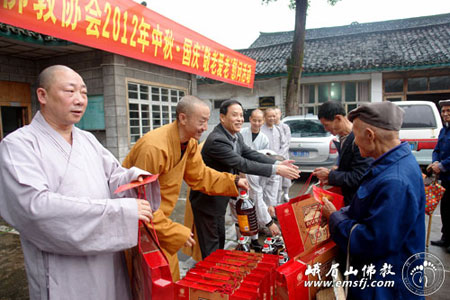 在中华民族传统佳节中秋节即将到来之际,为响应国家宗教局、四川省宗教局、乐山市宗教局及中国佛教协会、四川省佛协的号召,认真贯彻落实《关于在全国开展“宗教慈善周”活动的通知》精神,充分发挥佛教在建设和谐社会中的作用,继续保持、发扬峨眉山佛教协会乐善好施、关爱老人的优良传统。峨眉山佛教协会在会长永寿法师的带领下,于2012年9月20日至23日,在峨眉山市展开了以“敬老爱老”为主题的宗教慈善周活动。
