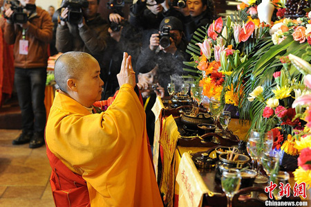 2012年11月27日,湖南省长沙市玉泉寺大雄宝殿落成典礼举行,来自韩国、新加坡,以及两岸四地的数百名僧众共同参与典礼,并为该寺全堂佛像开光。据了解,长沙玉泉寺始建于1368年,2006年开始新址重建,按照“五期六年”远景规划,拟于2015年完成全部重建工程。(图:杨华峰)