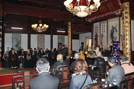 团长丸子孝法感恩诚信法师的热情接待,并带来永平寺贯首的问候,之后就永平寺的道风以及僧侣修行的现实状况作了详细介绍。希望两国佛教界永久的互相参学,为世界和平做出佛教应有的贡献。并祈愿中日永久和平、世界和平。随后,双方互赠礼物并在天王殿前合影留念。