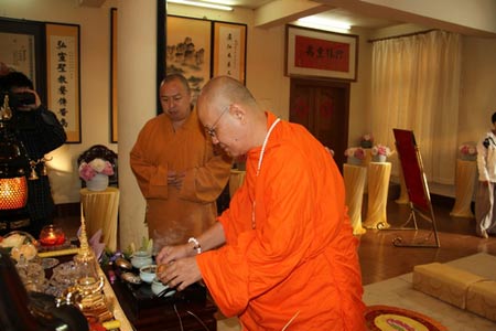 随后,副僧王一行在印顺法师的陪同下,参拜本焕长老舍利及法像,并于长老像前诵经祈福。