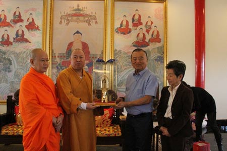 宾主双方首先互赠礼物。随后,双方就泰国迎请、供养本焕长老舍利及相关事宜进行了会谈。