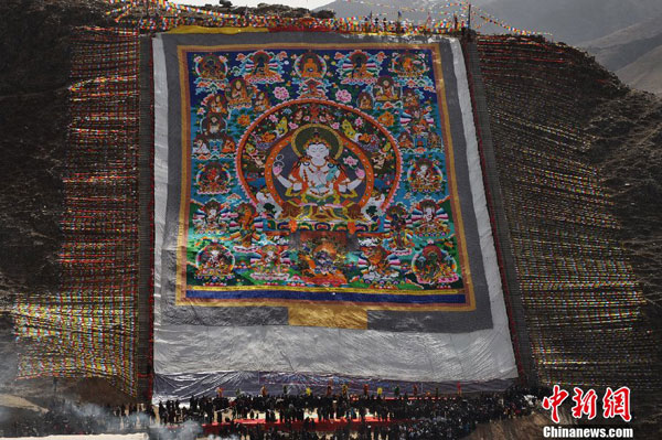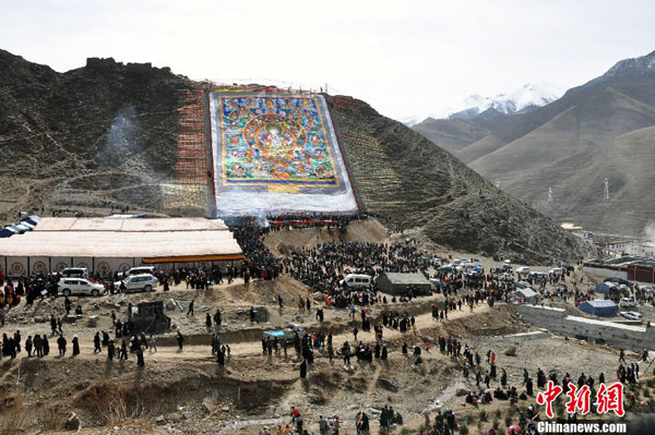 纪念青海玉树地震三周年 玉树各寺举行晒佛祈福大法会